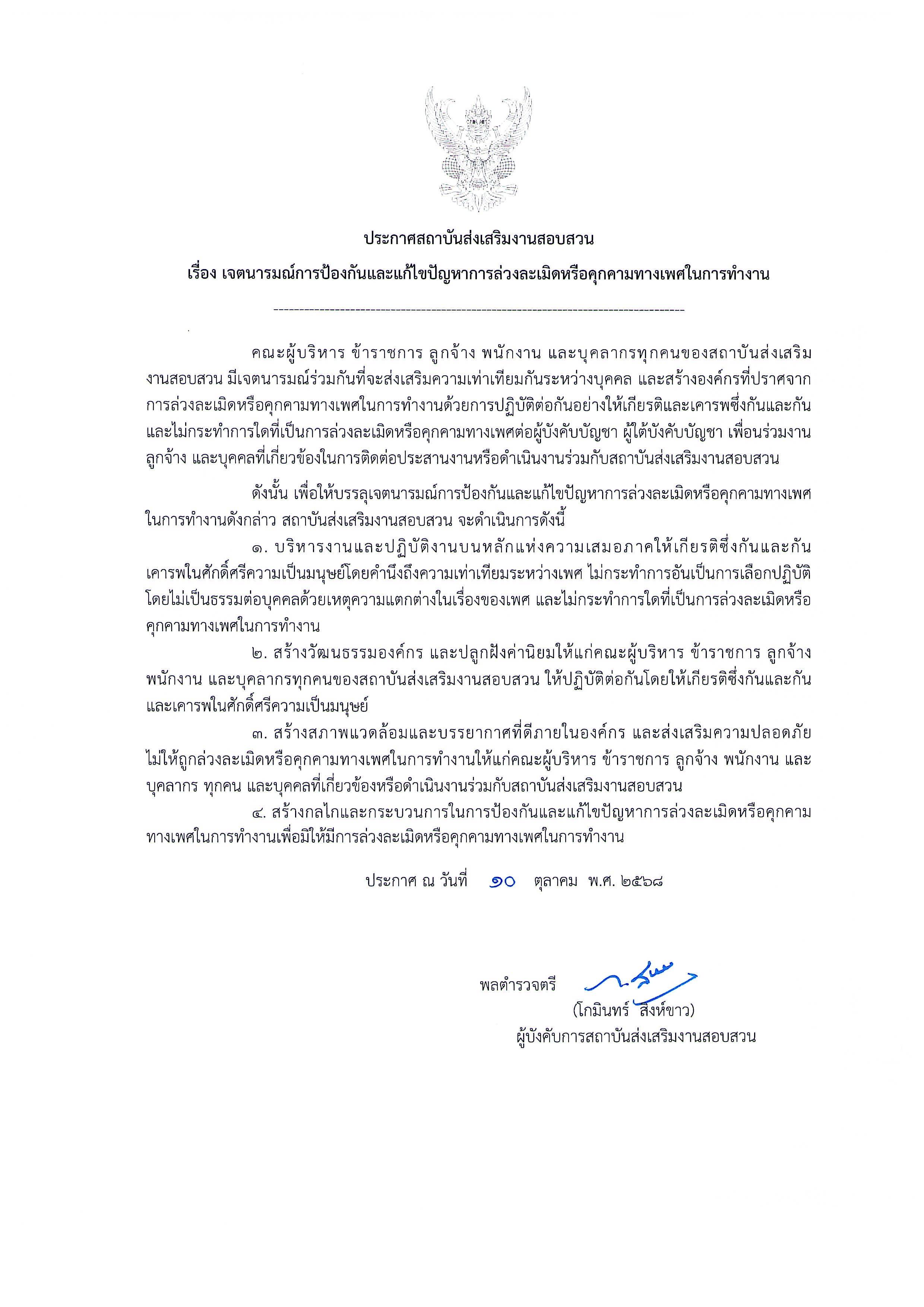 ประกาศ สถาบันส่งเสริมงานสอบสวน เรื่อง เจตนารมณ์การป้องกันและแก้ไขปัญหาการล่วงละเมิดหรือคุกคามทางเพศในการทำงาน