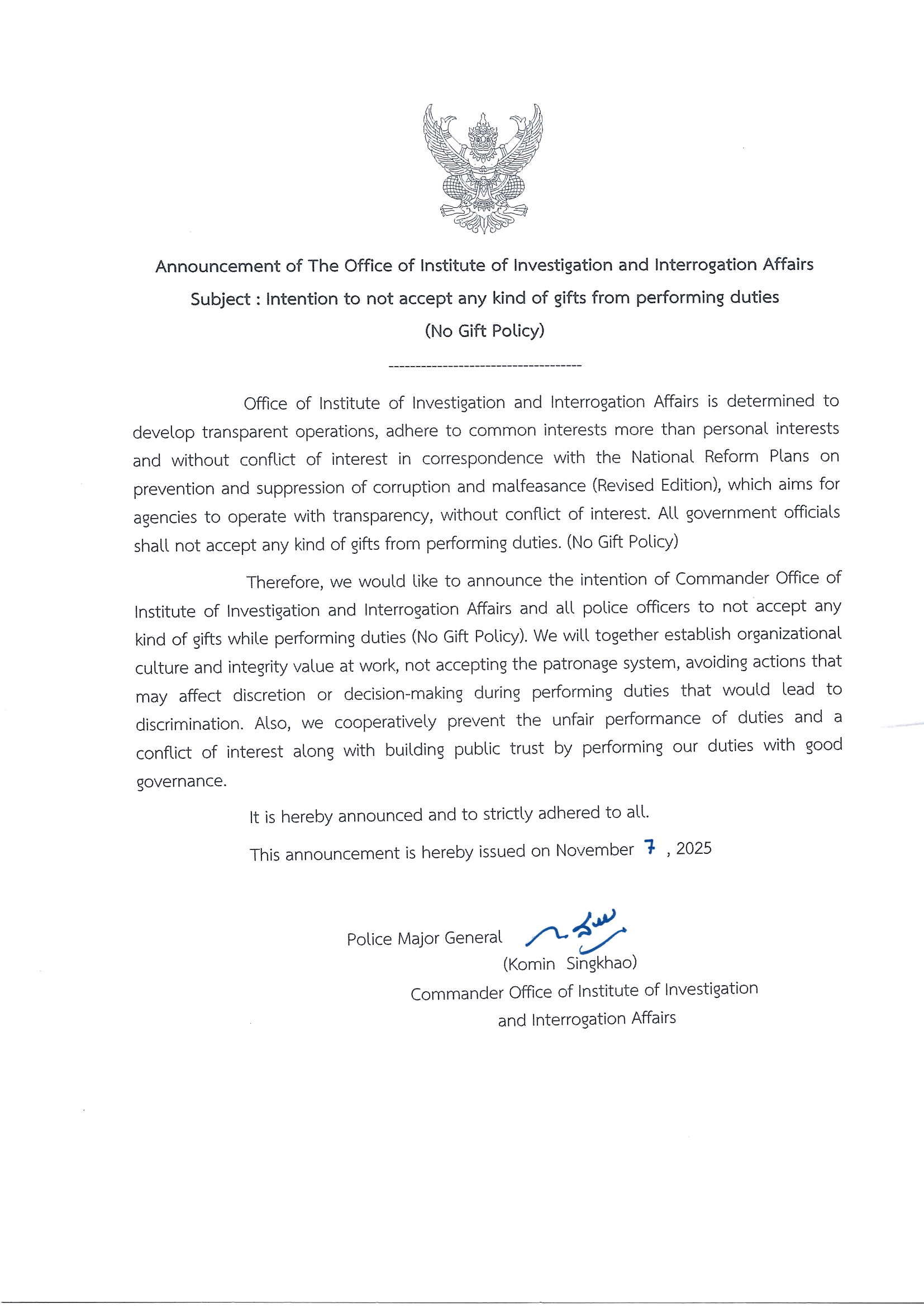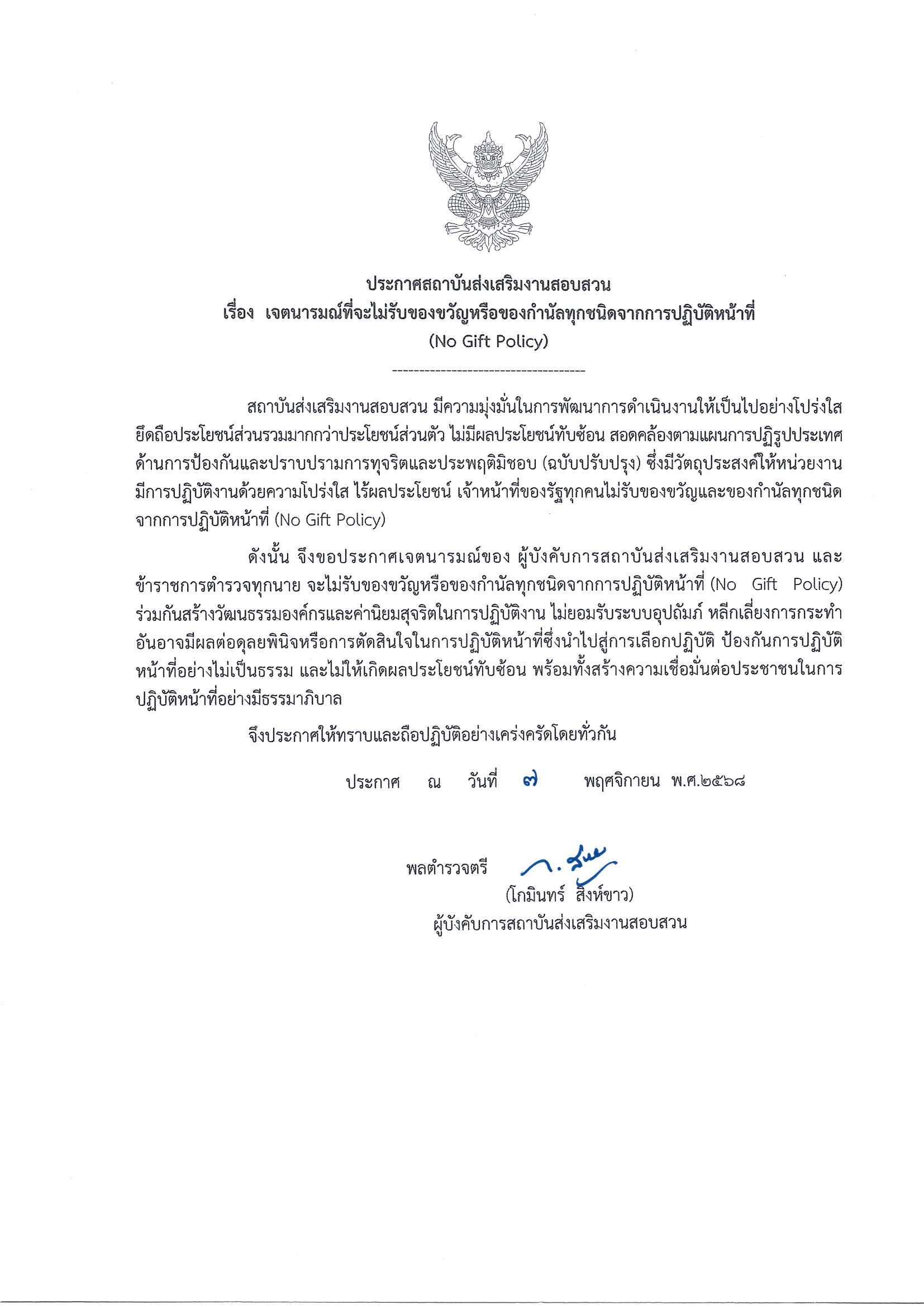 พล.ต.ต.โกมินทร์ สิงห์ขาว ผบก.สบส. มีเจตนารมณ์อันเข้มแข็งที่จะไม่รับของขวัญหรือของกำนัลทุกชนิดจากการปฏิบัติหน้าที่ เพื่อร่วมกันสร้างวัฒนธรรมองค์กรและค่านิยมสุจริตในการปฏิบัติงาน